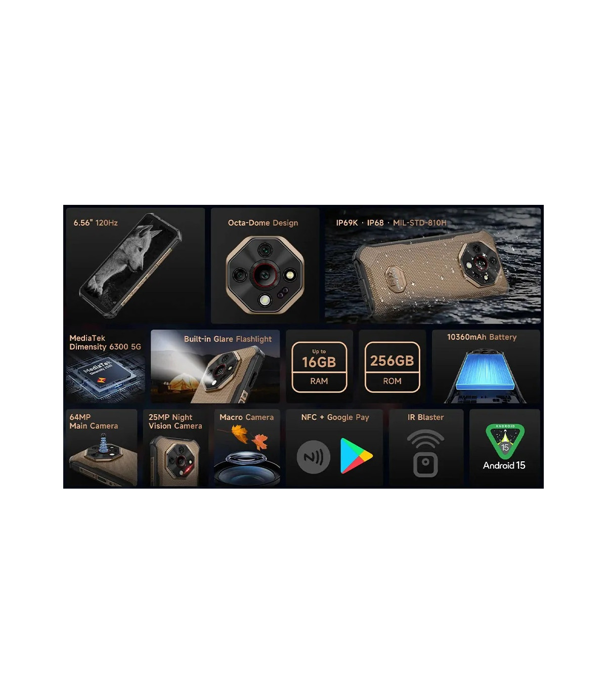 IP68 защита: Водоустойчив, прахоустойчив, удароустойчив корпус 6.6" IPS дисплей 1080x2408 pixels Mediatek Dimensity 6300 8 ядрен на 2.4 Ghz 12GB+24GB RAM , 512GB вътр.памет Две сим карти Android 14...