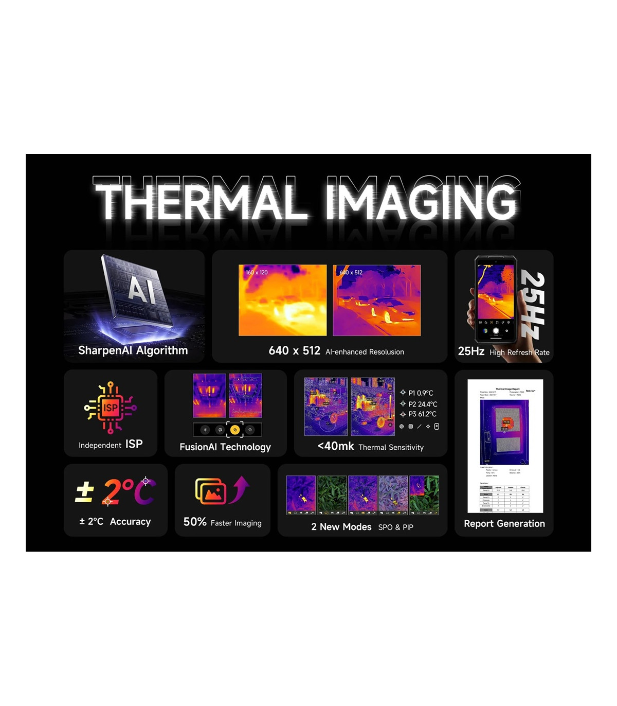 50MP+64MP(night)+50MP + Thermo камера Thermo Vue T2 640x512 пиксела, диапазон -20°C to 550°C